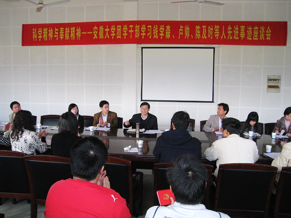 校团委书记王丁凡,学生处副处长徐震虹,各院系团干以及部分学生代表参加了座谈会。王丁凡主持座谈会并简要介绍了钱学森、卢帅、陈及时等人的先进事迹。与会老师、同学发言踊跃,围绕爱国奉献、舍己为人、积极创新、社会责任感等方面展开讨论,纷纷表示要向英雄人物学习、不断提高自身素质、为社会多做贡献。