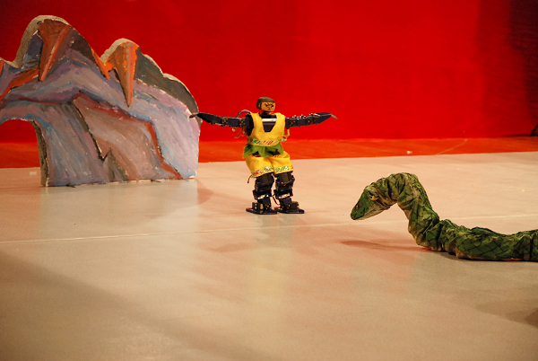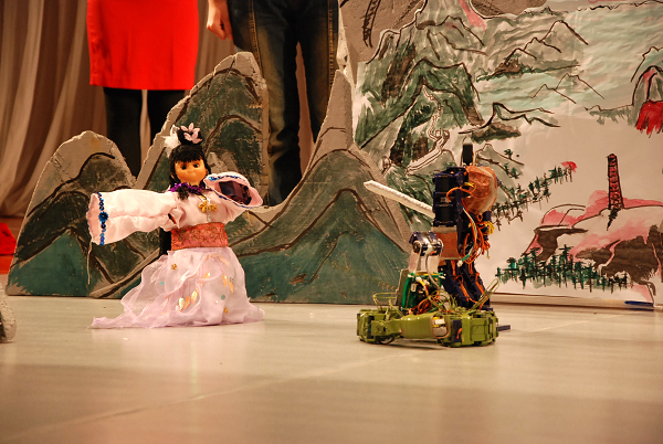 葫芦七兄弟打败蛇精后化作七色山将蛇精和蝎子压在山底,却被闻讯赶来的青蛇妖将七色山锯开,逼出葫芦娃。于是一场葫芦娃与蛇妖的大战拉开大幕。来自电子技术与科学学院的六名同学和艺术学院的1名同学组成的“梦缘队”用他们制作的机器人表现了这场大战。双足机器人葫芦小金刚灵活的动作赢得现场阵阵欢呼,而特殊机器人青蛇妖逼真的表演也为他们赢得掌声。