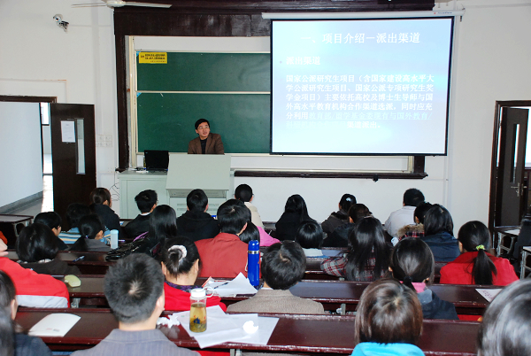 研究生院办公室主任何平从项目介绍、2010年选派政策、常见问题、注意事项及工作进度安排等方面就我校公派出国留学项目作了说明。