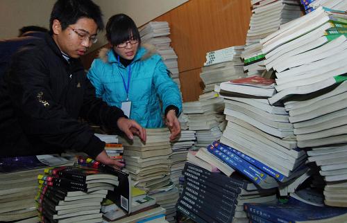 11月26日,安徽大学学生在勤工俭学中心选购旧教材。安徽大学勤工俭学中心从2005年起,收购学生的废旧教材,再以低价卖给需要的学生,实现了旧教材的循环利用。目前,该中心每年收购废旧书60吨左右,其中约25吨可循环利用。每年还举行旧书捐赠等公益活动,受到了学生的欢迎,产生良好的社会效应。(新华社记者 李健 摄)
