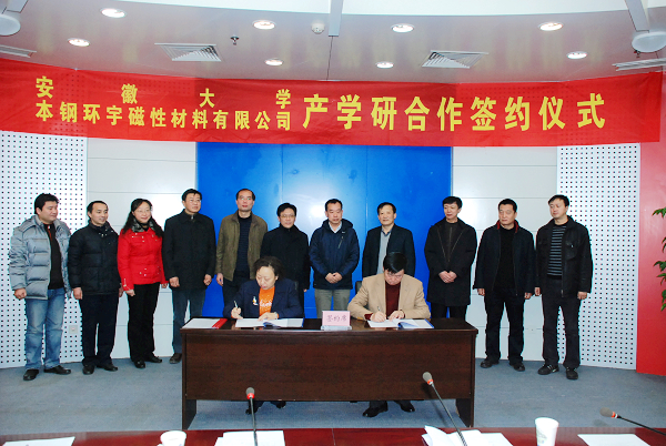 本溪钢铁公司总经理助理、综合工业公司总经理康伟,本溪钢铁公司化工厂厂长、本钢铁环宇磁性材料厂董事长阎春来,本溪钢铁公司化工厂党委书记孟宪海,本钢铁环宇磁性材料厂总经理邓文宝,本钢铁环宇磁性材料厂销售部部长郑长勇,我校督导员杨家芹,物理与材料科学学院院长孙兆奇,物理与材料科学学院党委书记张巍,磁性材料省工程技术研究中心主任刘先松及物理与材料科学学院部分老师和研究生出席了签字仪式。杨家芹、康伟,刘先松、阎春来先后代表双方在安大——本钢铁环宇磁性材料创新研究基地合作协议书、“湿压异性双四千永磁锶铁氧体”技术委托开发合同上签字。杨家芹、康伟、阎春来并分别发表讲话。签字仪式由校科技处处长俞本立主持。