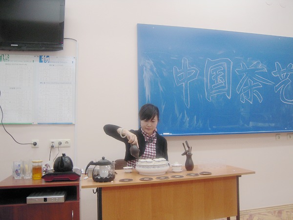 12月19日,孔子学院的中国汉办老师为本院的乌克兰学生、哈尔科夫国立大学中文专业学生及汉语爱好者表演了中国传统茶艺。伴着中国传统音乐,中国老师将选茶、选水、冲泡等知识娓娓道来,使同学领略到中国传统文化的神韵。