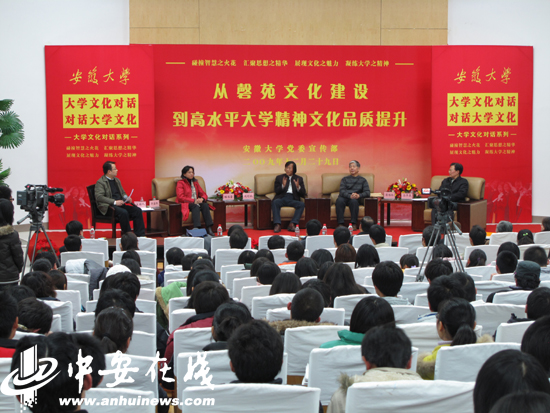 中安在线12月30日讯 (记者:岳茜茜,赵波)碰撞智慧之火花,汇聚思想之精华。展现文化之魅力,凝练大学之精神。昨晚7点,在安徽大学磬苑校区水上报告厅,由该校党委宣传部主办的大学文化对话系列活动拉开帷幕。第一期活动以“从磬苑文化建设到高水平大学精神文化品质提升”为主题,邀请了凤凰卫视《纵横中国》栏目总策划、、著名作家、安大校友胡野秋,安徽日报高级编辑、诗人、校友蒋维扬,安徽大学高教研究所所长程雁雷及安徽大学中文系资深教授汤华泉受邀担任对话嘉宾。学者在台上引经据典,妙语连珠,获得台下观众阵阵掌声。
