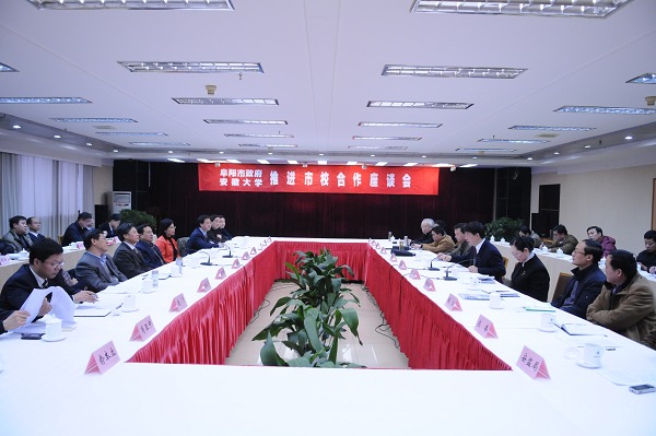 下午4时30分,阜阳市政府在阜阳国际大酒店举行阜阳市安徽大学推进市校合作座谈会。座谈会由阜阳市委副书记、市长孙云飞主持。学校代表团全体成员,阜阳职业技术学院、阜阳市科技局、教育局、经委、发改委、农委、人社局、安监局、环保局等单位负责同志参加了座谈会。