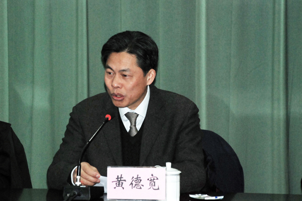 黄德宽在讲话中表示拥护省委、省政府的决定,欢迎程桦同志来校履职,感谢省委组织部、省委教育工委对安徽大学领导班子建设的长期关心和高度重视。黄德宽说,自从1997年主持学校行政工作以来,我有幸经历安徽大学改革发展的一个重要历史时期。十四年来,全校的师生员工给予我莫大的信任、充分的理解和大力的支持。今后,我将认真抓好学校党建工作,努力把党委建设成为学校改革发展的坚强领导集体,支持程桦同志履行好校长职责。我相信并期望,学校行政领导班子在程桦同志的领导下,继续保持良好的工作状态,开拓创新、团结合作、勤政廉洁、尽职尽责,不断开创学校发展新局面。希望全校师生员工在学校党委和行政领导下,把握机遇、拼搏进取,为实现“国际知名、国内一流高水平大学”的建设目标,不畏艰难,努力奋斗!