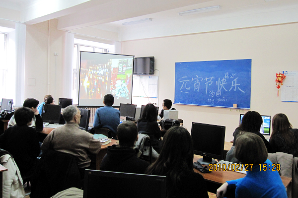 当天上午,孔子学院多功能教室里装饰一新,象征中国传统元宵佳节的大红灯笼高高挂在教室门口,黑板上“元宵节快乐”几个大字洋溢着浓浓的节日气氛。
