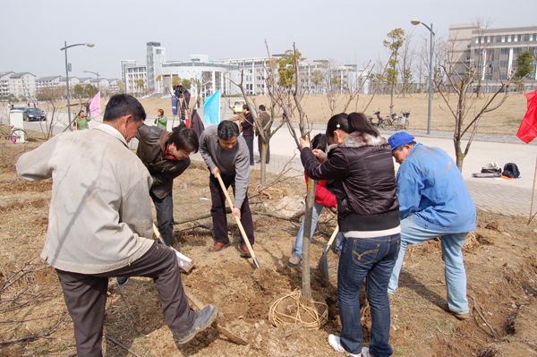 本网讯(新闻中心网宣办记者 熊裕娟 鲍小明 王艳芳)阳春布泽德,植树正当时。今年3月12日是第32个植树节。上午10时许,校领导黄德宽、程桦、杜先能、王源扩、李仁群、王群京、许继荣、胡小松、杨家芹等与后勤、物管员工及环境保护协会的同学们一起,兴致勃勃来到磬苑校区办公楼西侧参加植树活动。