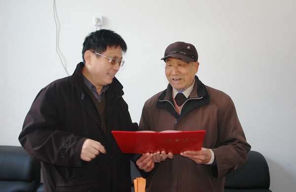 离退休工作处处长樊晓东向胡老(右)转递荣誉证书本网讯(离退休工作处 杨腊娥)3月16日在合肥召开全省教育系统关心下一代工作会议,对全省教育系统关心下一代工作先进集体和先进个人进行表彰。我校离休干部、抗战老战士胡彬获“安徽省教育系统关心下一代工作先进个人”荣誉称号。