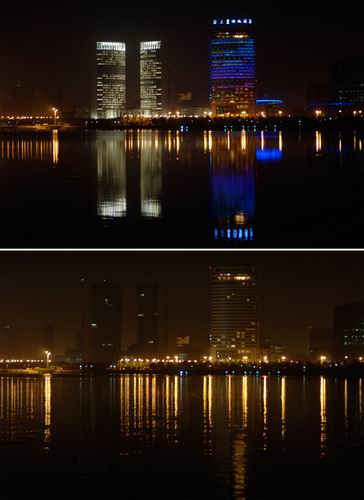 3月27日,熄灯前后的合肥市政务大楼(上、下)对比图。当日,世界自然基金会倡导的“地球一小时”活动得到全世界100多个国家和地区响应,该活动旨在唤起全球公众对地球气候变化问题的关注。我国的北京、上海、南京、香港等许多城市也加入到这一活动中。 新华社记者李健摄