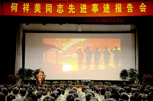 本网讯(新闻中心网宣办记者鲍晓明 李福凯)4月6日下午,何祥美同志先进事迹报告会在我校磬苑校区适之楼多功能厅隆重举行。南京军区政治部宣传部副部长江伯友,省军区政治部主任马家利,我校校长程桦、校党委副书记李仁群等出席报告会。我校校直机关和院系负责人、全体国防生和普通学生代表,在肥高校国防生、军校生代表共一千余人聆听了报告会。报告会由李仁群主持。