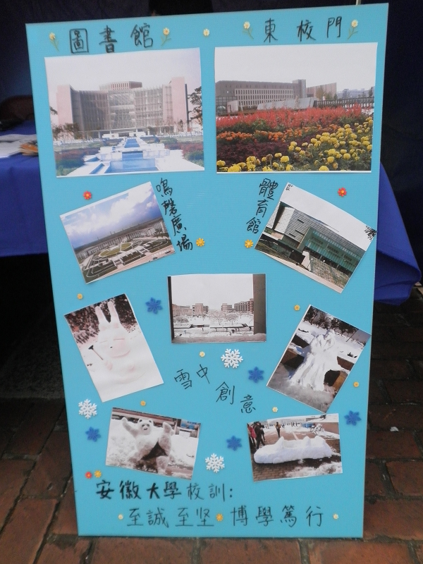 从上午8点半起,我校交换生江舒妍等同学就早早张到达活动现场,布置场地,悬挂展板,热情介绍学校基本情况,并欢迎静宜大学同学们参加今年暑假赴我校游学夏令营活动。活动过程中,江舒妍、张新星等同学还准备了关于我校的5个小问题,帮助台湾学生了解安徽省和安徽大学。活动一直持续到下午5点,加深了交换生之间、交换生与静宜大学同学之间的相互了解和友谊。