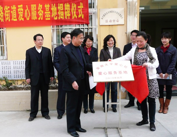 本网讯(学生处 郑 格)“仁以知恩图报为德,滴水之恩当涌泉相报。” 4月7日下午,校爱心社服务基地在合肥市和平路街道揭牌。校教育基金会、学生处、团委及和平路街道相关负责人与爱心社学生代表一起出席了揭牌仪式。