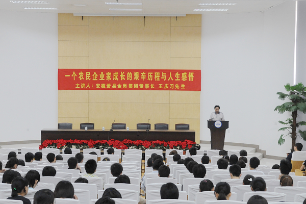 本网讯(新闻中心网宣办记者纪 云 熊裕娟)5月26日下午,磬苑校区博北d101座无虚席。在这里,安徽萧县金岗集团董事长王庆习为以他名字命名的爱心社近300名同学讲述了他成长为一名农民企业家的艰辛历程和人生感悟。