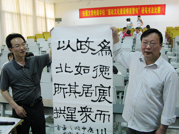 校纪委调研员郭大泉来到赛场指导并现场挥毫泼墨。附属学校霍爱国老师现场题写的“为政以德,如北辰居其所而众星拱之”书法作品赢得师生阵阵赞叹。