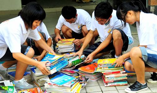8月7日,安徽大学数学院的学生们正在社区图书室门前整理捐赠的图书。新华社记者 许逆之 摄