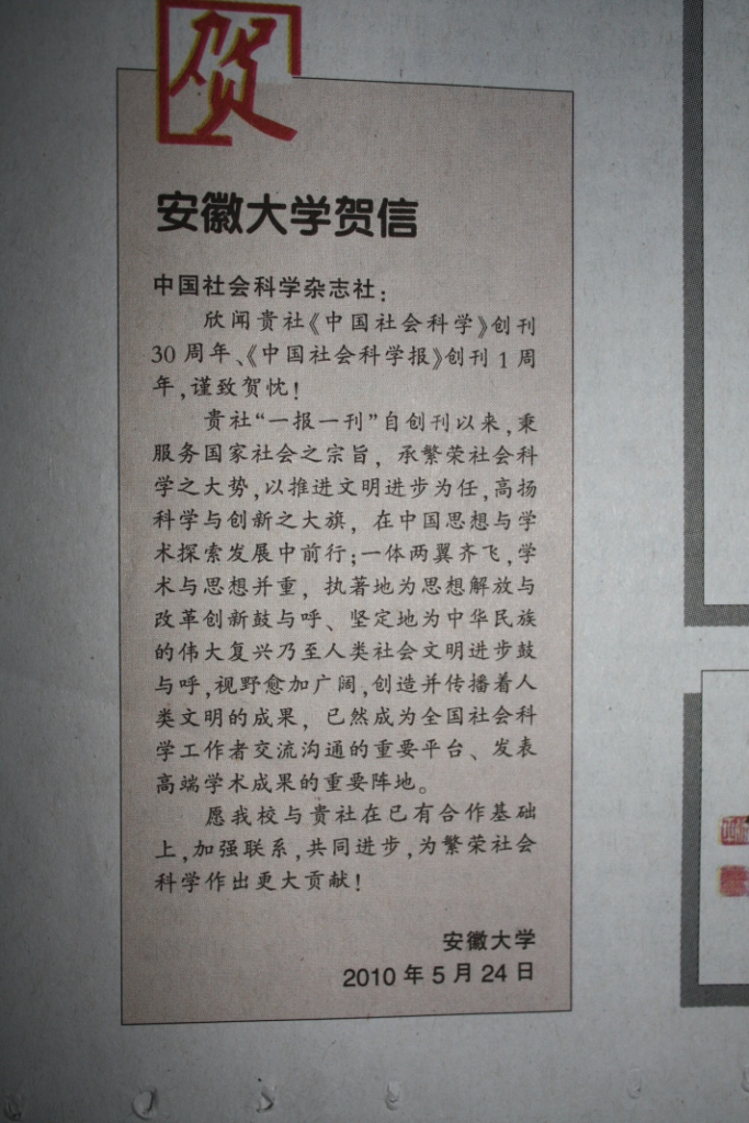 在《中国社会科学》创刊30周年暨《中国社会科学报》创刊1周年之际,安徽大学致信祝贺!