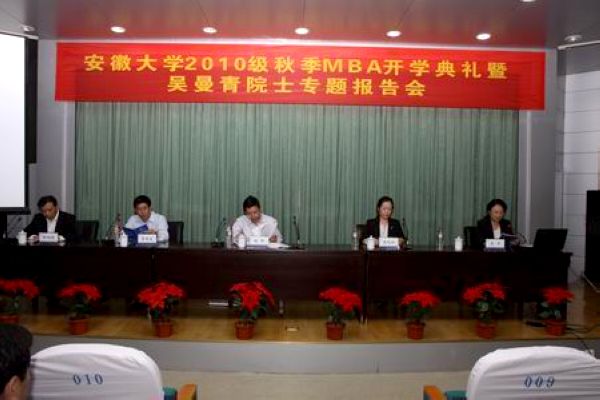 本网讯(新闻中心)9月29日,安徽大学2010级秋季MBA新生开学典礼在安徽大学逸夫图书馆第一报告厅隆重举行。安徽大学校长程桦教授、副校长王群京教授、研究生院副院长李明发教授、商学院院长李晓玲教授、商学院党委书记杜鹏程教授、MBA教育中心副主任李开教授以及部分MBA任课教师出席了开学典礼。开学典礼由MBA教育中心副主任李开教授主持。