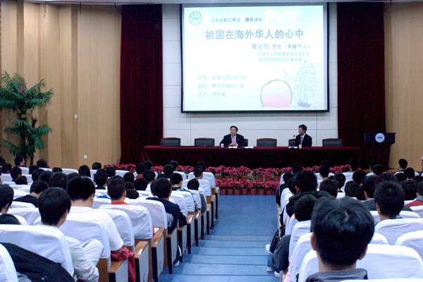 管必红用朴实的语言,生动的案例,从励志、感恩、培养能力和奋斗四个方面为同学们做了精彩报告。他首先向同学们介绍了海外华人华侨在热爱祖国,维护祖国利益,促进祖国统一等方面所付诸的各种行动,尤其是说到他自己带领一批爱国华侨在美国费城的独立广场第一次升起五星红旗时,全场响起了热烈的掌声。