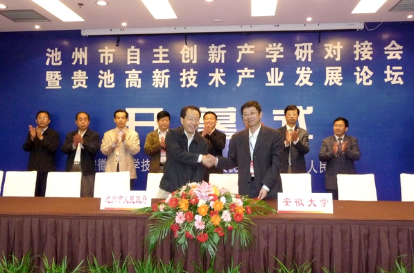本次对接会由省科技厅、池州市人民政府主办。对接会上,我校与池州市人民政府签订了校市合作协议,并就“电动汽车用电机驱动设计”、“邻苯二甲酸脂基双子系列表面活性剂产品的研究开发”、“氢氧化镁的表面改性”、“降低CaCO3表面能及分散性研究”、“食用菌工厂化生产技术研究”、“菜用马铃薯微型种薯生产技术研究”等项目分别与安徽欧霖机电有限公司、安徽中天化工有限公司、池州灵芝化建材料科技有限公司、池州市金艺化工有限公司、东至县兴农菌业有限责任公司、池州家家农业科技发展有限公司等公司签订了10项技术合作协议。
