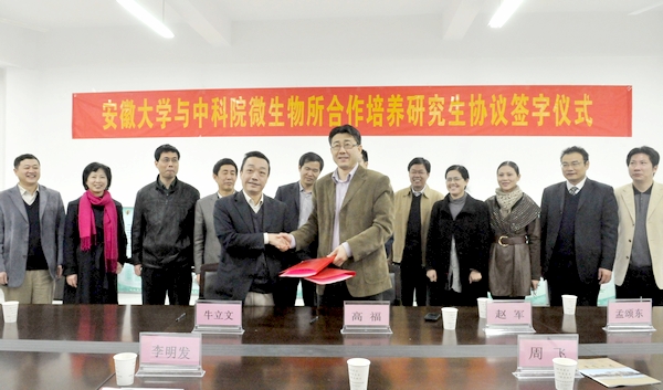 牛立文在签约仪式上首先简要介绍和回顾了学校的研究生培养历史和现状,他指出,随着国家对研究生类型、培养机制和教育模式的调整,我校对研究生的培养也正从量的扩大转向质的提高。当前国家对于研究生的培养类型由单一学术型向学术型与应用型转变,其培养模式改革也逐步深入,不同机构、组织与高校共同探索联合培养新模式。安徽大学首创与地方政府联合培养研究生新模式得到了《光明日报》、《中国教育报》等中央暨省市媒体的广泛关注,此次与国家级科研院所的合作必将为不同类型研究生培养提供更为优质的平台,有利于促进我校研究生人才培养质量的提高。中国科学院微生物研究所人事处处长赵军表示,本次合作一方面给研究所带来新的生力军、补充了科研队伍的缺口,另一方面也给研究生提供了科技平台和文化环境,促进了科教结合。