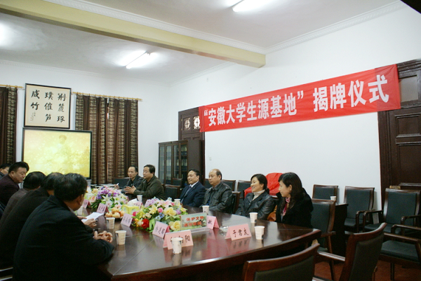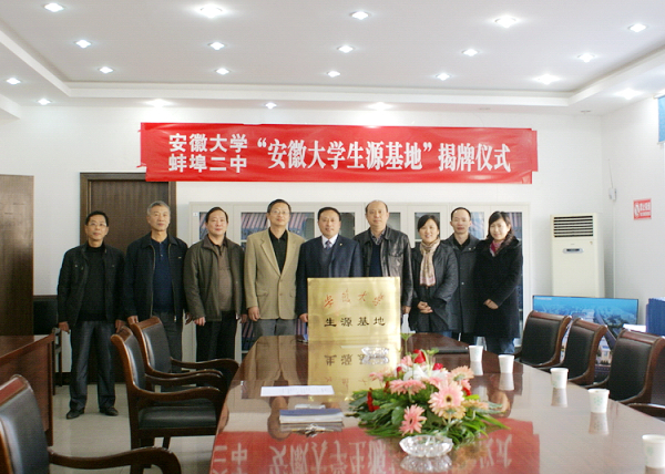 本网讯(教务处)11月17日,我校蚌埠二中、怀远一中两生源基地揭牌。 副校长杜先能、王群京,教务处、学生处和校团委负责同志等赴蚌埠出席了揭牌仪式。怀远县副县长张向群、教育局局长金宏,蚌埠二中校长李新义,怀远一中校长王广喜及两校有关领导参加了有关活动。教务处处长薛照明与两校校长签定合作协议,王群京与张向群、李新义为两校生源基地揭牌。 据了解,蚌埠二中和怀远一中均为省级示范高中,多年来为我校输送了不少优质生源。