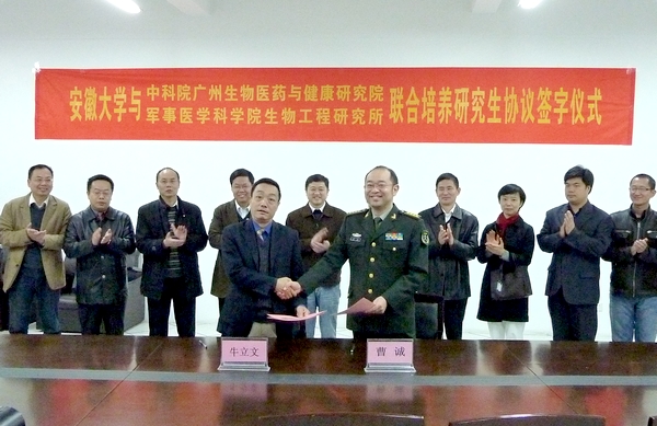 签字仪式上,牛立文介绍了学校历史及在人才培养尤其是在研究生教育方面的基本情况;古京介绍了中国科学院广州生物医药与健康研究院的概况,并就我国研究生教育发展速度快、对科研贡献大等特点做了分析;曹诚介绍了军事医学科学院生物工程研究所的情况,表示与安徽大学开展此项合作,是对研究生培养模式的有益探索。