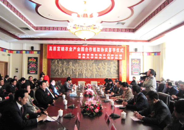 据了解,青海省西宁周边地区和海东地区拥有中国面积最大、富硒含量最佳的富硒土壤资源。青海省委书记强卫、省长骆惠宁明确指出这将是青海省发展特色农业的绝佳条件,号召全省积极行动发展富硒产品和产业,加快传统农牧业向现代化农牧业的转变。海东地区积极响应省委省政府号召,抢抓机遇、深入调研、全面规划,全地区将以富硒种植、养殖产业化为依托、富硒加工产业为支撑、富硒高新技术转化为突破,打造集富硒产品种植、养殖、加工、生态旅游为一体的“高原硒都”。我校校友企业家协会多位成员从今年3月份以来多次到青海考察,足迹遍布青海省海东、海西、海北州,经过认真调研、比较,最终选定在海东州的这个投资项目。