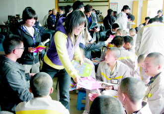 法制日报 2010-12-04 安徽省未成年犯管教所是安徽青少年法制教育基地,为纪念“12·4”全国法制宣传日确立十周年,突出“以法育人,引法入监”主题,12月3日,安徽大学法学院40多名法学专业的大学生带着法律书籍、贺卡等小礼物,走进未管所,与100多名失足少年面对面真情互动,联合开展“与法同行”大学生进监送法宣教活动。(本报通讯员 惠巍 张鹰 本报记者 李光明摄)
