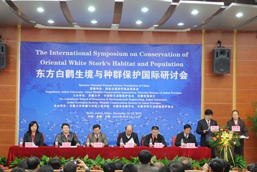 12月11日,东方白鹳生境与种群保护国际研讨会在安徽大学举办。本次研讨会由安徽大学、中国野生动物保护协会、安徽省林业厅主办,安徽大学资源与环境工程学院、安徽省动物学会、安徽省野生动植物保护协会承办。来自中国、俄罗斯、韩国和日本的专家学者50多人参加了会议。