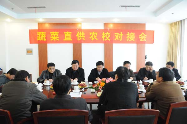对接会由张勇主持。他代表三校后勤服务集团感谢舒城县委、县政府一行冒雪来校参加蔬菜直供农校对接,并表示,蔬菜直供是稳定蔬菜价格的重要举措,后勤服务集团自办的学生食堂要积极参加,对于引进的学生食堂也要积极引导,以便更好地让利给学生。郭本纯、杜世安分别发言,表示舒城县政府将做好服务工作,牵线搭桥,积极协调,加强监督,并要求蔬菜基地做好蔬菜的标准化生产,将安全、新鲜的蔬菜供应给高校学生食堂。丁思年代表蔬菜生产企业表示要组织好货源,利用现有的运输条件,减少中间环节,既解决菜农卖菜难,又降低蔬菜价格,让利于学校,让菜农和学生都能享受到农校对接的实惠。
