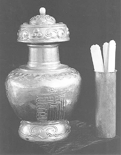 3、实施金瓶掣签。1792年,清廷下令整饬活佛转世制度,废除了“吹忠”(护法神)指认转世灵童的做法,改行金瓶掣签。即将3—4名转世灵童的名字、出生年月,用满、汉、藏三种文字写于象牙签牌上,放进瓶内,选派喇嘛祈祷七日,然后由驻藏大臣等人主持,在大昭寺释迦牟尼像前筛选正式认定。此外,清政府还于雍和宫另设一金瓶,当漠南、漠北蒙古及东北的盛京(沈阳)、中原的北京、五台山、承德等地藏传佛教寺院的高僧活佛转世时,其灵童的认定由理藩院尚书主持掣签,过程同上。