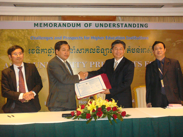 我校是亚洲大学校长论坛主要发起院校之一,在论坛活动中有着较大影响。论坛期间,黄德宽书记会见了我校国外的一些姊妹学校校长和老朋友,就加强进一步合作与交流、促进学校之间的密切伙伴关系等事宜交换了意见。应柬埔寨诺顿大学邀请,黄德宽一行考察了诺顿大学,并应邀与柬埔寨专门研究大学就两校发展加强合作交流交换了意见、签署了合作备忘录。