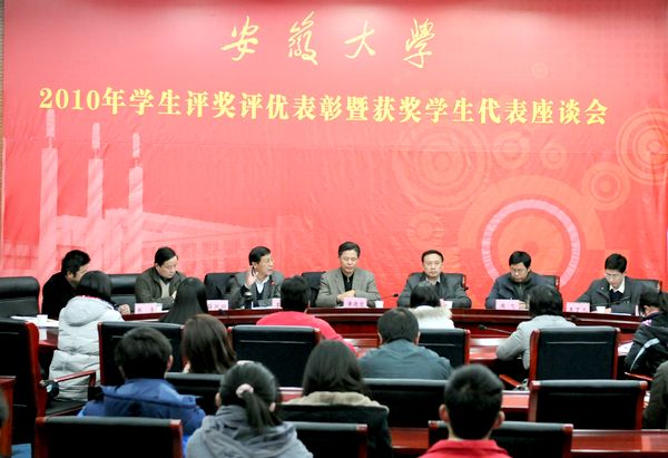 会上,副校长杜先能宣读了获奖学生名单。与会领导向获得2010年度国家奖学金、国家励志奖学金、宝钢奖学金、学术科技奖学金和“2010年度十佳先进班集体”的获奖学生代表颁发了荣誉证书。来自各院系的获奖学生代表分别从学习、实践和成长等方面进行了座谈发言。