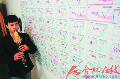 小赵租住的房子也是他平日上班的地方。由数字组成的简谱贴在墙上,很是显眼。“2009.9”是小赵的网店开张的日子。略显瘦弱的小赵很健谈,既是卧室,又是办公室的墙上,贴满了半面的快递单,大致数了数,得有几万块钱的金额。另一面的墙上,挂着包裹整齐的笛子、葫芦丝等。