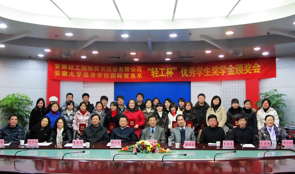 安徽轻工国际贸易股份有限公司总裁、我校兼职教授柳夕良,安徽轻工国际贸易股份有限公司相关部门负责人,经济学院党政领导及部分青年教师,与“轻工杯”奖学金获奖同学一起出席了颁奖会。
