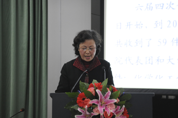 教代会提案工作委员会成员姜苏含作提案工作报告。报告包括提案征集、提交情况,提案交办、答复情况,重要提案落实情况,优秀提案和提案承办先进单位评选情况说明等4个部分。报告指出,六届四次会议提案征集工作从2009年12月8日开始,到2010年4月8日截止,共收到59件提案,涉及17个代表团。经过提案委员会两次认真审查,正式立案50件。