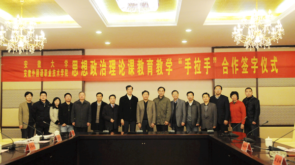 本网讯(新闻中心)4月6日下午,我校与安徽外国语职业技术学院思政理论课教育教学“手拉手”合作共建签字仪式在安徽外国语职业技术学院举行。校党委书记黄德宽、副书记李仁群,安徽外国语职业技术学院党委第一书记虞志方,省教育厅思想政治工作处处长杨建华等出席了签字仪式。