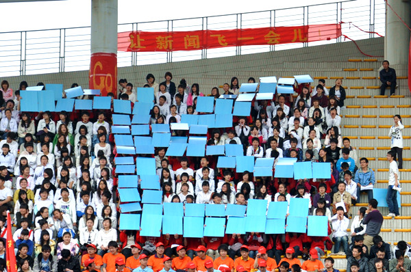 再来看看新闻传播学院那群酷劲十足的同学,他们要“让新闻飞一会”,看台上穿着红色衣服的同学摆成一个大大的“飞”字,预示着今年的运动会新闻传播学院要一飞冲天,一鸣惊人。“春风吹,战鼓擂,新闻学院勇夺魁”,霸气十足,让酷酷的新闻飞一会吧。