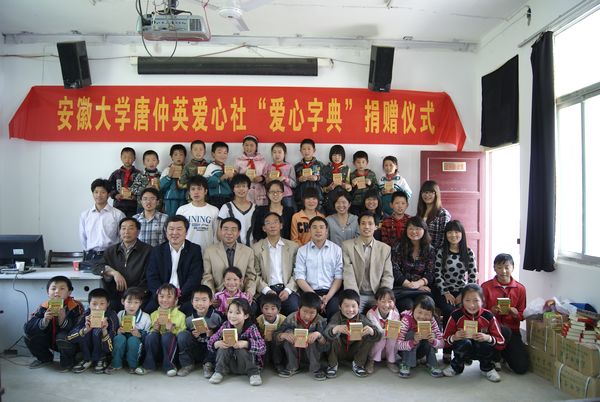 舒城县洪庙中心校位于该县南部山区,交通极为不便,当地留守儿童比例很高,学生学习资料匮乏。唐仲英爱心社在了解情况后在社内学生中发起募捐活动,并用捐款购买的277本新华字典送到山区孩子们的手中。唐仲英爱心社副社长高晓丽说:“虽然小小的字典并不值很多钱,但是我们希望弟弟妹妹们能够好好利用手中的字典,扩大阅读面,积累更多的知识,为以后学习打下良好的基础。共同弘扬唐仲英基金会服务社会、奉献爱心、推己及人、薪火相传的宗旨”。
