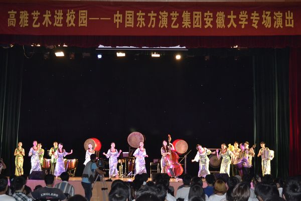本网讯(校团委)5月13日晚,由校团委主办的高雅艺术进校园——中国东方演艺集团安大专场演出在适之楼多功能厅精彩上演,为全校师生带来了一场视觉与听觉的盛宴。本次演出由新近改制重组的中国东方演艺集团旗下的东方民乐团精心编排。艺术家们用世界各地的乐器演绎了各个国家和地区的名曲,周维、王霁晴、肖金声、苏金娃等多位著名中青年艺术家的精彩演艺,获得了观众一致好评。 音乐会持续近两个小时。优美的旋律,艳丽的服装,多样的风格,让我校师生足不出户便欣赏到了世界各国的音乐精华。