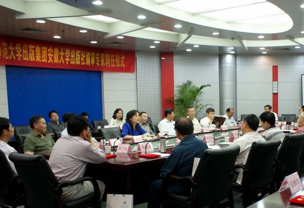 叶子首先向各位领导、专家汇报了北师大出版集团和安徽大学出版社的发展情况。叶子说,此次聘请安徽省各个优势学科的专家学者及出版专家为我社编审专家,就是期待充分发挥各位专家的学术优势和专业优势,充分发掘社内社外两个资源,做好重大选题的策划与规划,优化图书产品结构,加强图书品牌建设,着力提高编审质量。康建中汇报了合资重组后安徽大学出版社在法人治理机构、组织结构和管理机制方面的变化。康建中指出,改制之后,安徽大学出版社依然坚持以社会效益为主、质量至上的出版理念。随着出版社经营规模迅速扩大,书稿的审稿量也迅速增大,必须借重外聘编审专家的学术优势、专业优势对选题质量、图书质量严格把关,最终把精品学术成果以图书的形式展示给社会大众。