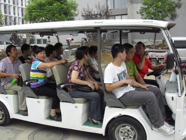记者跟随一名新生从西门进入校园,由于行李太多,这名新生直奔停在路边的校园巴士,别看这种车比较简单,但是很是实用,司机丁金栓笑呵呵的说:“两条腿肯定没有我们四个轮子省力呀。”由于新生接待处人比较多,所以司机都会从外围绕行。“今天是开学第一天,来学校的人真的很多,我们就一趟一趟的把他们送到要去的地方,一天大概要干八个小时吧。”丁金栓说。