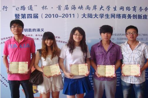 全国大学生网络商务创新应用大赛是由中国互联网协会主办的全国性赛事,是工业和信息化部“阳光绿色网络工程”的重要内容。本届建行“e路通”大赛自2010年12月启动以来,吸引了来自全国2800余所高校20多万名大学生参与,大赛分为校内选拔赛、分赛区决赛、全国总决赛和海峡两岸交流赛四个阶段,在华东赛区,我校获得两个综合一等奖,七个单项一等奖等。参加本次决赛的有151所高校的239支团队。国台办、工信部、教育部等部门领导、高校教师代表以及中国建设银行、淘宝网、和讯网等企业代表莅临现场为获奖团队颁发获奖证书,并就当前的网络商务发展及应用进行了探讨。