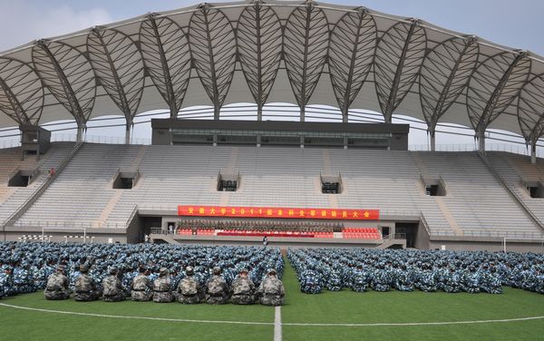 本网讯(新闻中心网宣办学生记者刘乐峰 徐庆庆)八月末的合肥大学城,秋高气爽,景色宜人;2011级本科新生们朝气蓬勃、满怀希望,齐聚美丽的磬苑,开始了崭新的大学生活。8月29日上午,2011级本科生军训动员大会在磬苑校区主体育场隆重举行。