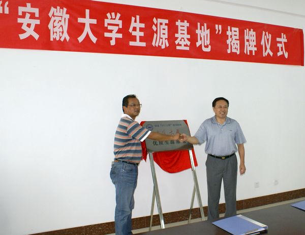 本网讯(毕涛)8月28日下午,我校与省级示范高中——淮北市实验高级中学共建生源基地揭牌仪式在淮北实验高中举行。副校长杜先能出席并为生源基地揭牌。教务处处长薛照明与淮北实验高中负责同志签定合作协议。 揭牌仪式上,杜先能发表致辞,对我校与淮北实验高中的交流合作寄予厚望。
