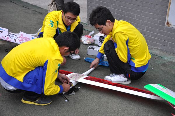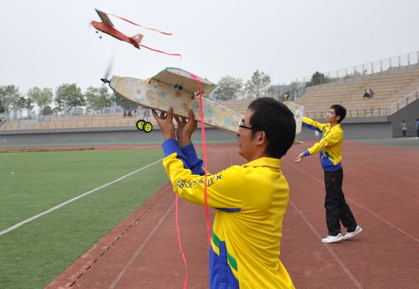 成立仪式结束后,航模队进行了飞行汇报表演。一架以合肥四体会大放异彩的点火飞机外形为基础的“灰喜鹊”特技表演机冲上了天空。紧接着,一架飞机冲刺上天,这是我校学生自主设计制造的航模,飞机式样是学生们自己设计的。