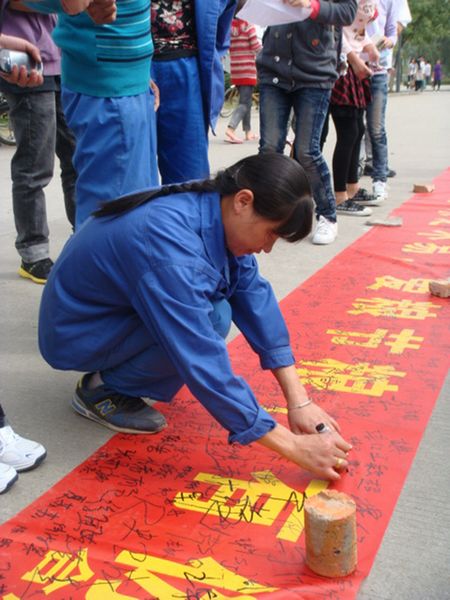 不仅过往的同学在横幅上签了名,就连后勤的工作人员也拿起笔,认真地在上面签了名,表达对节约粮食的支持。