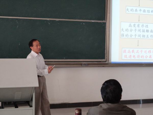 占肖卫从有机高分子光电材料的历史背景、有机小分子给体材料、聚合物给体材料、聚合物受体材料四个方面,畅谈了他在有机高分子光电功能材料领域的研究体会,并向师生介绍了近期有机高分子半导体的合成、结构与性能的关系、以及在有机发光二极管、有机场效应晶体管、有机太阳能电池方面的应用最新研究进展。报告结束后,占肖卫还详细回答了师生的提问,并就有关问题进行了深入的交流和探讨。