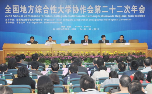 据悉,本次年会共有来自全国各地的24所地方综合性大学的60余位代表出席,会议围绕“贯彻纲要精神,推动地方综合性大学深化改革与科学发展”这一主题,进行了学术探讨与工作交流,并发表了《2011年全国地方综合性大学吉首宣言》。