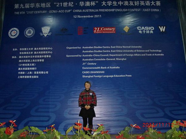 本网讯(新闻中心通讯员 汪勤)11月12日下午,在华东理工大学举行的第9届华东地区“21世纪•华澳杯”大学生中澳友好英语大赛中,我校外语学院英语专业2010级董越同学喜获一等奖。